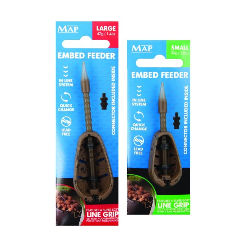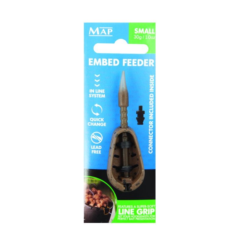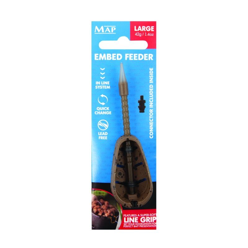 The MAP Embed Inline Fishing Feeder is a game-changing addition to any angler's tackle box. Its innovative design and unique integrated line grip system provide a significant advantage in bait presentation, ensuring that your hookbait remains in the prime position to be taken by fish. With its front-loaded design, deep bait cavity, and adjustable hooklength options, this feeder delivers enhanced casting accuracy and range, making it the ultimate choice for anglers who demand the best from their equipment.