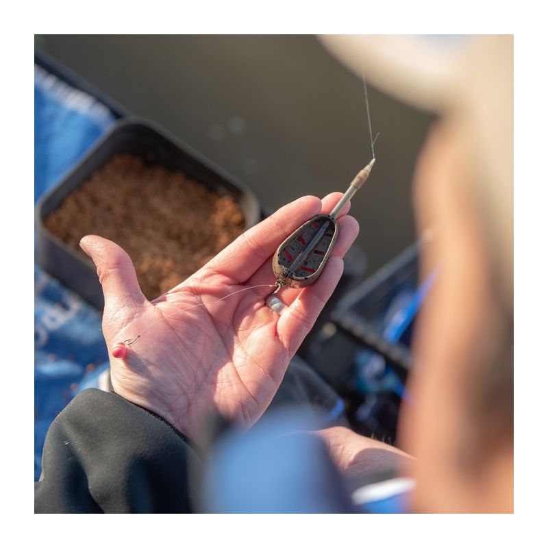 The slotted rubber grip allows you to effortlessly adjust the length of the hooklength within the feed, enabling you to customise your setup according to fish behaviour or your desired hookbait reaction. This feature is particularly beneficial when using wafters and pop-ups, as it allows you to control bait movement effectively.