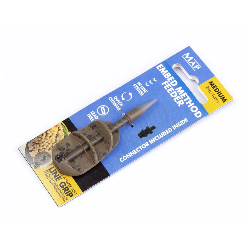 MAP Embed Method Feeders are following on from the success of the original Embed feeder, and offering the same alignment clip that made them so successful. Front-loaded for improved casting distance and accuracy with a sloped base that minimizes water displacement and noise on impact.
