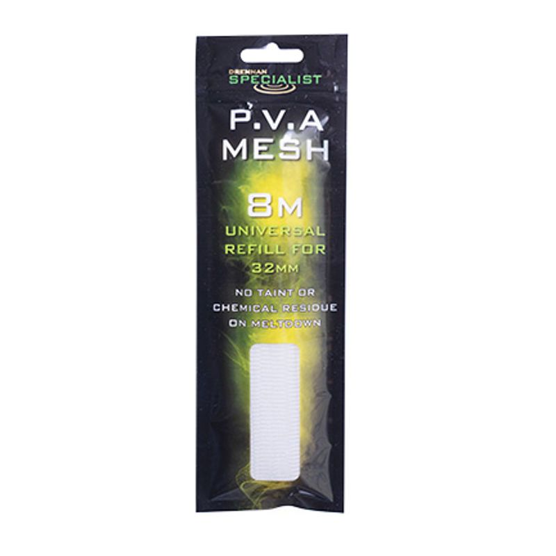 Drennan Specialist PVA Mesh Refills are 8m long in the 32mm diameter. Designed to fit directly onto the Specialist 32mm tubes supplied with the PVA kits.